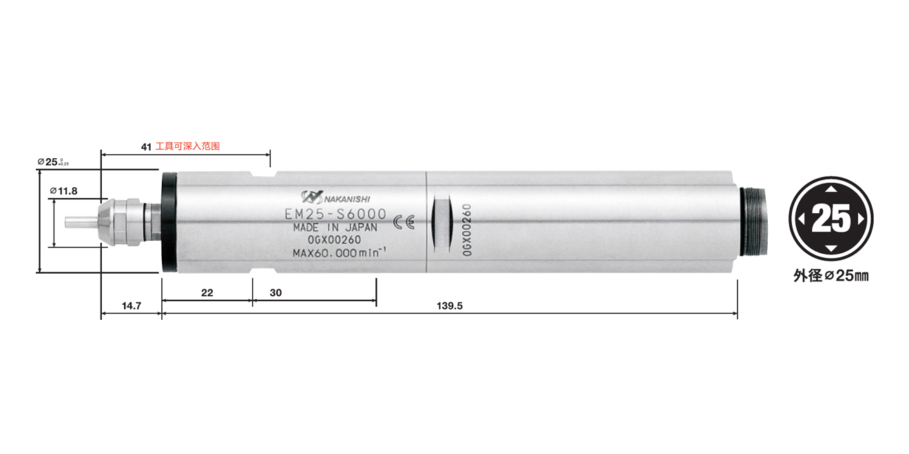 | EM25-S6000 | 7858 | φ25 mm | 60000 min-1 | 1μm以內(nèi) | CHA系列(φ0.5~φ4.0mm) | 250W | 375g |