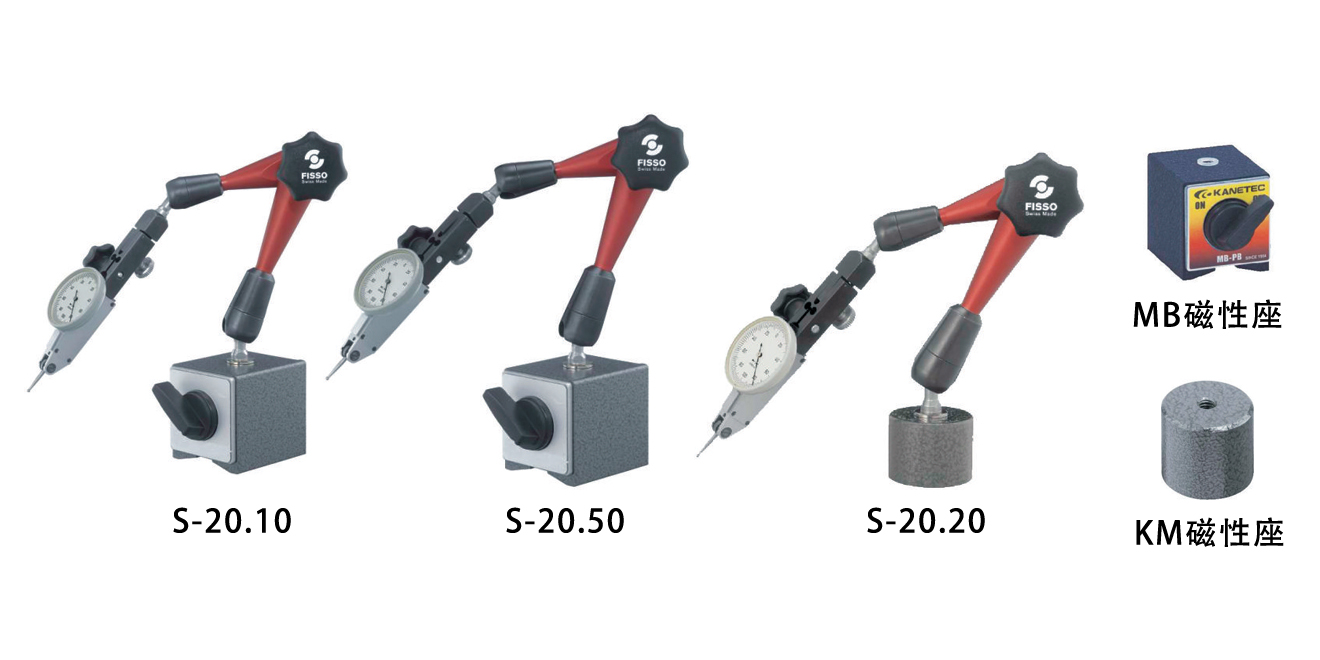 S-20F僅為萬(wàn)向關(guān)節(jié)臂(F表示帶微調(diào)裝置);S-20F+S+TM表示萬(wàn)向關(guān)節(jié)臂加上代號(hào)為S的鋼制柱體(φ8mm高50mm,訂貨編號(hào)為5.460),TM表示底座是罐形永磁體