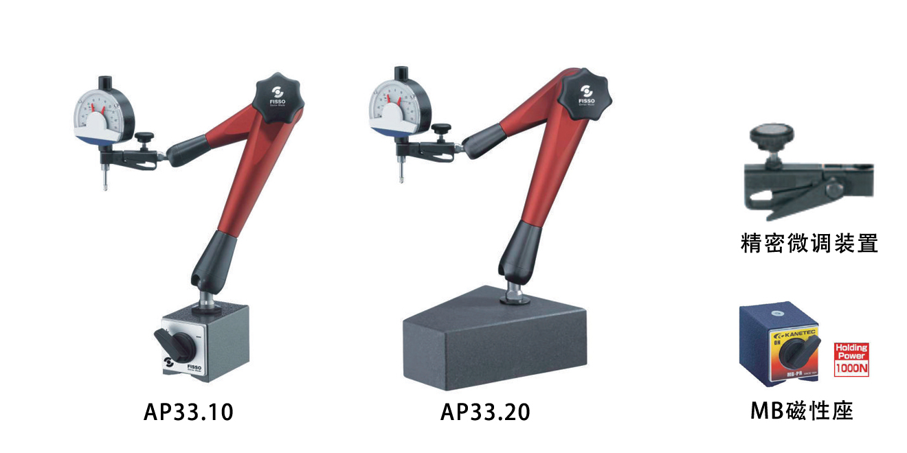 A-33P僅為萬(wàn)向關(guān)節(jié)臂(P表示0.1mm級(jí)精密微調(diào)裝置);A-33P+M表示萬(wàn)向關(guān)節(jié)臂帶燕尾槽量表架,M表示底座是開(kāi)關(guān)磁力座